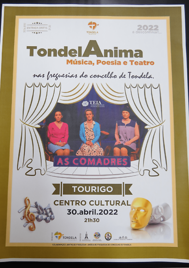 A Junta de Freguesia decidiu que o espetáculo que lhe coube, será exibido no Centro Cultural e Desportivo do Tourigo. Assim, no próximo Sábado, dia 30 de Abril, pelas 21 horas e 30 minutos, o TEIA-Teatro Experimental de Intervenção de Alvarim, apresentará um espetáculo intitulado "As Comadres", para o qual estão todos convidados. É conhecida a qualidade deste Grupo de Teatro Amador, oriundo da vizinha Freguesia de Dardavaz. A entrada é gratuita. SÁBADO VAMOS TODOS AO TEATRO